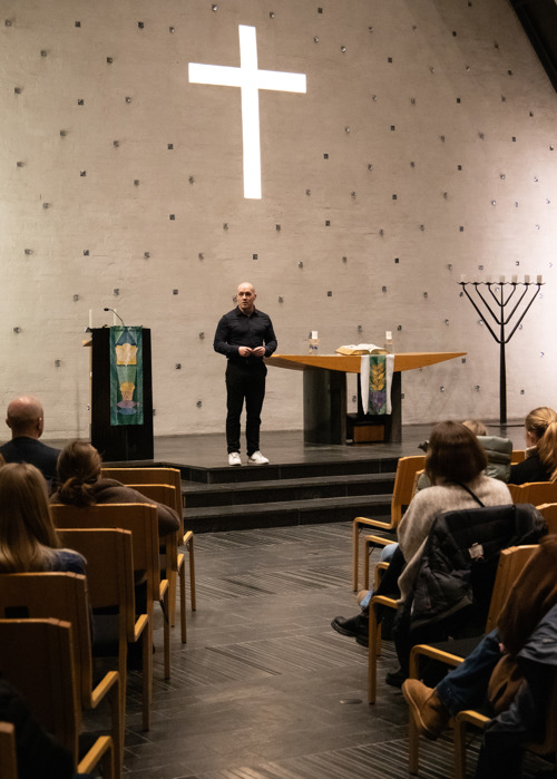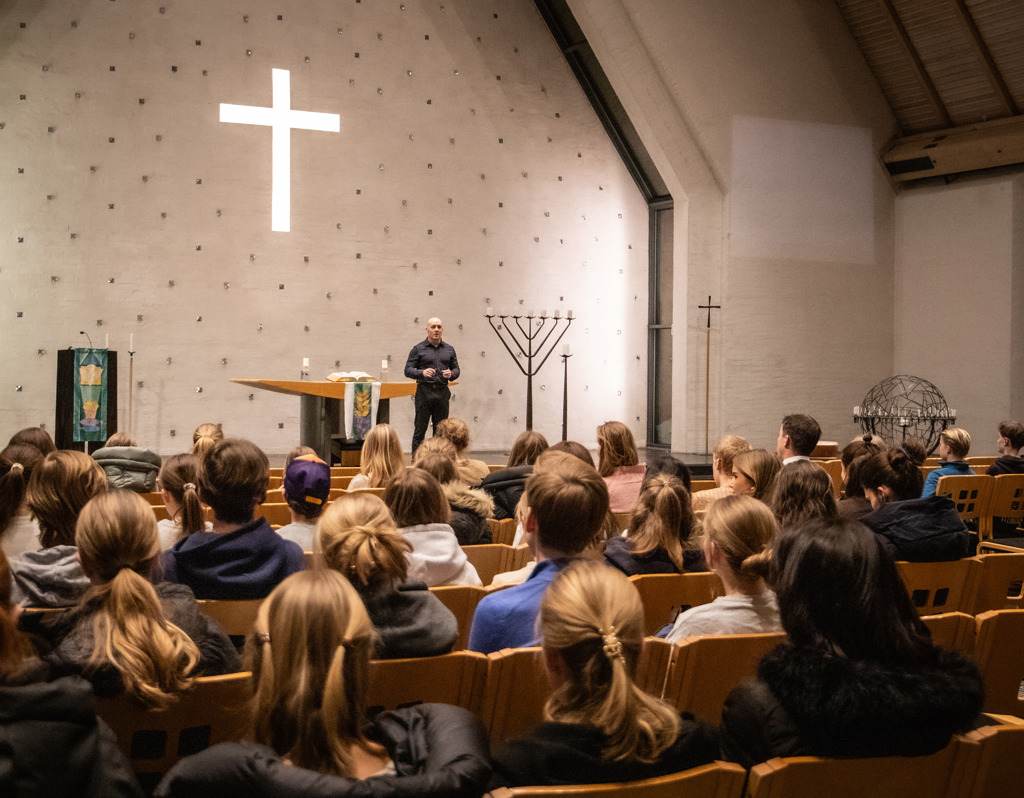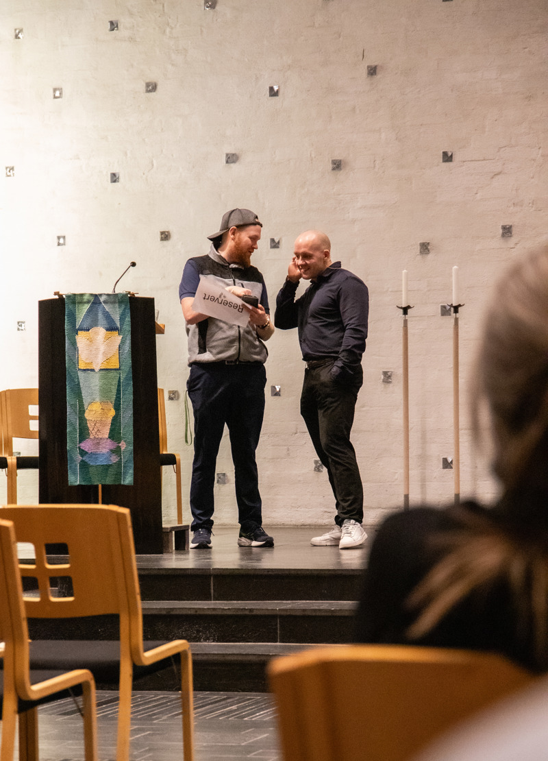 Etter foredraget var det mulighet for å sms’e inn spørsmål til Simen via kateket Geir. Det strømmet inn spørsmål med både personlig preg og på mer generell basis fra konfirmantene. Simen besvarte alle på sin sikre og trygge måte.